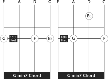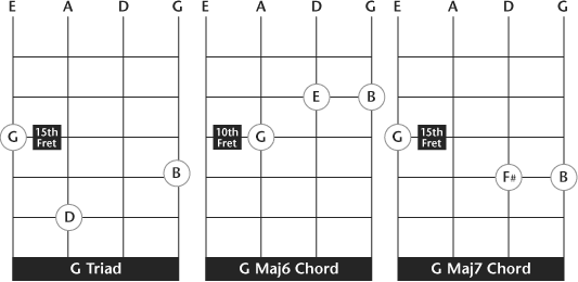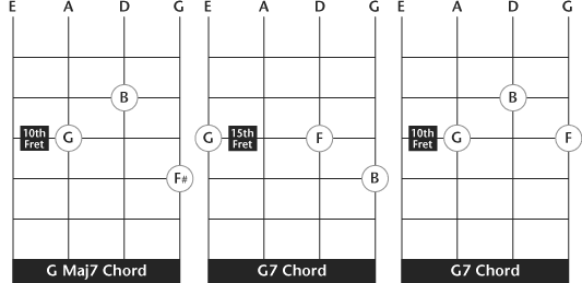 The following diagrams can help get you started in your chord explorations. These voicings are basic. There are many variations, and as always, I encourage you to experiment with as many different chord types and voicings as you can think up.