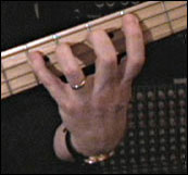 For the left hand positioning, I recommend using the "classical" technique, whereby the thumb acts as a guide along the middle or lower portion of the back of the neck. Your hand may then be rotated toward the front of the fingerboard, allowing more access for the fingers. Leave some space between your palm and the neck. I don't recommend keeping your palm in contact with the back of the neck, as I see many beginners do, because this cramps your hand motion and severely limits your fingers' ability to maneuver. The only exception to this would be when using the left hand thumb to mute the strings for a particular technique, such as slapping. Also, if you don't use your little finger already, start now. It will play a big part in your left hand's dexterity. |