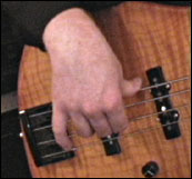 Try placing your right hand just behind the first pickup with the thumb resting on either the pickup or on the E string. This gives you an "anchor" point from which to effectively pull the strings. I like to use the E string as a thumbrest because this position allows my right hand to have quick access to the other strings, plus it keeps the E string muted when I'm not using it. When I play the E string, I just slide my right thumb up along the body a half-inch or so, to give the E string just enough room to vibrate. Your right forearm acts as a fulcrum, so that the weight of your arm doesn't rest entirely on your right thumb. To get a mighty bass sound, firmly pull the string in a motion that also pushes down slightly on it, just before releasing it. This yields a very full, powerful attack. The pressure with which you play with your right hand is an integral part of the tone you produce. As you release the string, your finger stops on the adjacent string, keeping it from ringing sympathetically. Most players use the first and second fingers in an alternating fashion. With faithful practice, you can develop tremendous speed and dexterity using just these two fingers. Some players use their thumb to pluck downward (and sometimes upward) on the string. Some players use their 1st, 2nd, and 3rd fingers in combination with their thumb. There is no "right" way, just the one that works for you and your style.